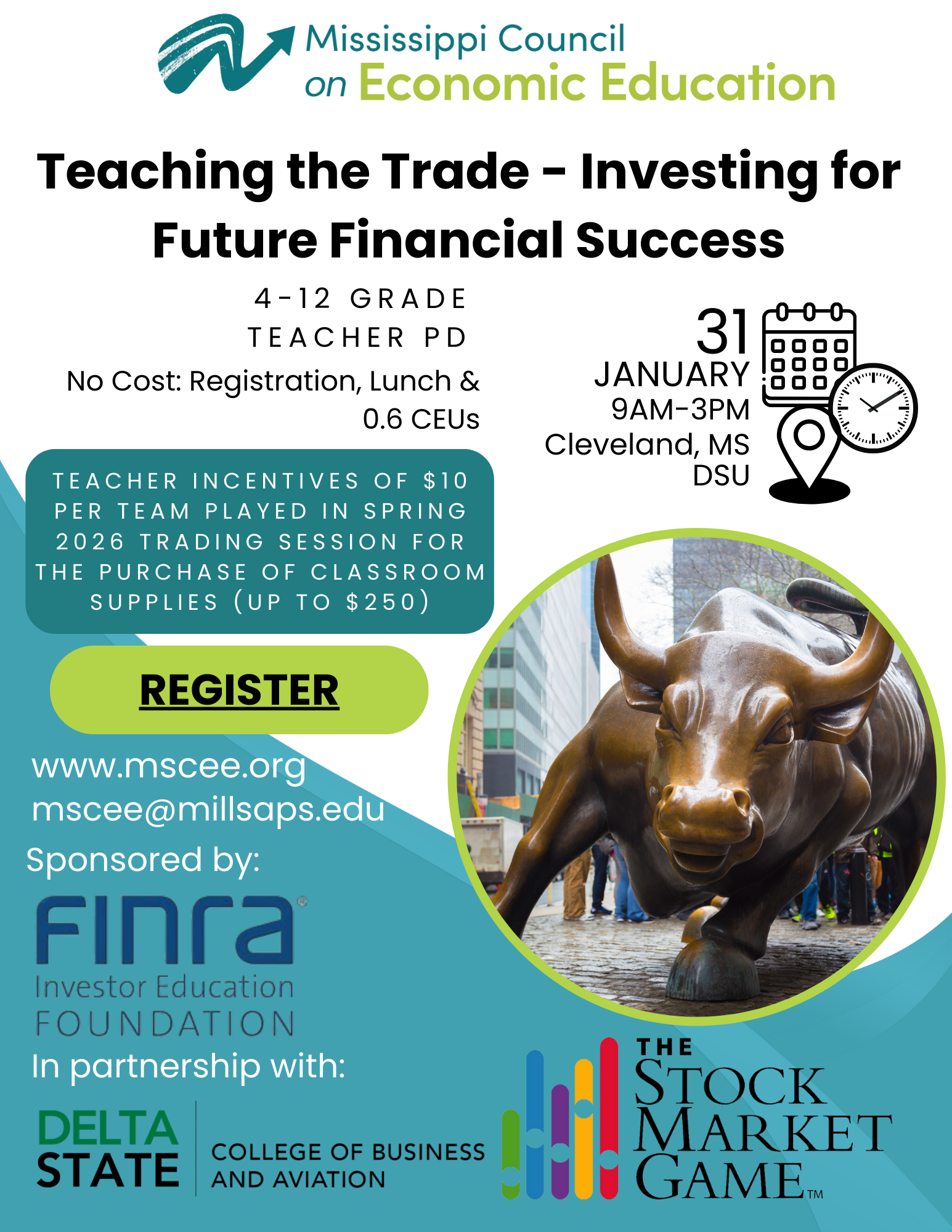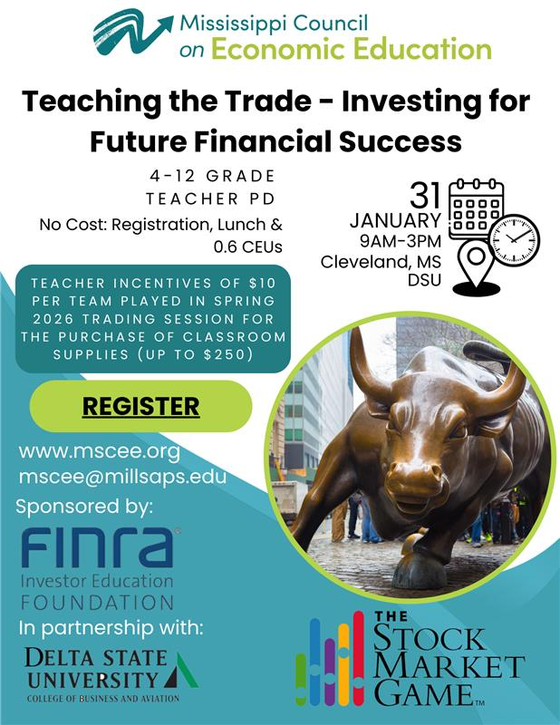 **MCEE Cancellation Policy: MCEE and our sponsors invest significant resources for teachers to attend workshops at no cost. Sponsors are making an investment in you, and it is important that they receive a positive return on their investment. This occurs when you attend the workshop and implement what you learned in your classroom. Cancellations made within 10 days of the workshop and "no-shows" will be charged a $25 fee. Cancellations can be made by emailing mscee@millsaps.edu. No exceptions will be made.