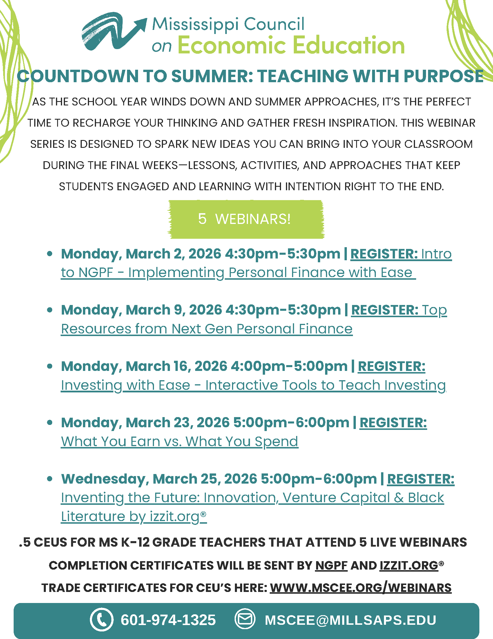 The Mississippi Council on Economic Education is pleased to partner with our national Council for Economic Education (CEE), the Federal Reserve Bank of Atlanta (FRB ATL), Federal Reserve Bank of St. Louis (FRB STL), Izzit.org and NextGen Personal Finance (NGPF) to bring you professional development webinars for teachers nationwide.